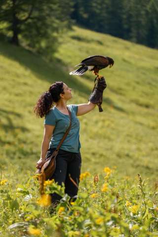 Découvre de près la fascination de la fauconnerie ! Dans la fauconnerie Galina à Malbun, tu peux partir en excursion avec un Harris-Hawk et devenir toi-même fauconnier.