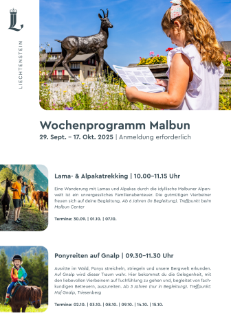 Au Liechtenstein, l'automne sera une expérience pour toute la famille : du 29 septembre au 17 octobre, le programme de la semaine d'automne dans les régions de montagne garantit des moments de vacances inoubliables. Avec des trekkings en lama et en alpaga, vélo électrique guidés vélo électrique ou des promenades à poney, une aventure attend chaque jour.