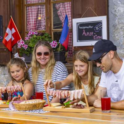Chez Pradamee, du lait fraîchement préparé, du fromage alpin, du fromage à pâte molle, du fromage aigre, du beurre et du yaourt sont disponibles pendant les mois d'été. Tous les produits peuvent être dégustés et achetés sur l'Alp. Un espace extérieur avec des sièges vous invite à vous attarder.