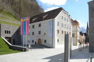 Vue extérieure du musée national du Liechtenstein à Vaduz avec des drapeaux colorés et une vue sur la façade historique.