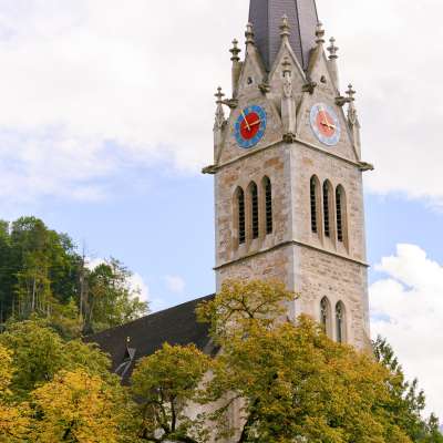 L'église en pierre naturelle impressionne par sa tour frontale marquante avec un casque pointu, un élégant escalier extérieur à deux bras et des sculptures en bronze artistiques dans des niches en ogive. À l'intérieur, c'est une église-halle à trois nefs avec une nef centrale à quatre travées qui t'attend.