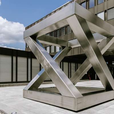 Ces formations de lettres peuvent atteindre jusqu'à cinq mètres de haut, mais elles continuent malgré tout à circonscrire le cube. En observant le cube Z, on constate que la tige de la lettre, qui relie les barres transversales supérieure et inférieure, est "mal" orientée : au lieu d'aller du haut à droite vers le bas à gauche, elle relie le haut à gauche au bas à droite. Le Z est donc dessiné à l'envers. Mais si l'on regarde à travers la sculpture sur la face opposée du cube, on reconnaît la lettre Z dans son orthographe correcte. La face avant du cube montre ainsi l'envers de la lettre, la lettre est écrite sur la face intérieure du cube, et ce n'est que lorsqu'on se trouve au centre du cube que le signe prend tout son sens.