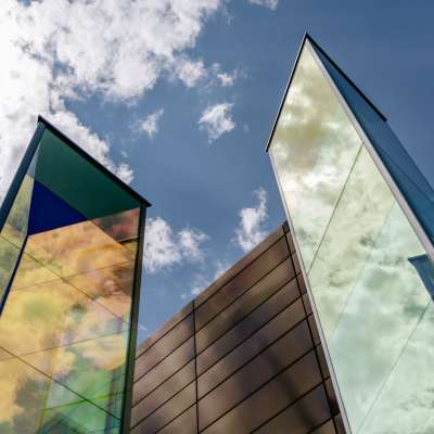 Les sculptures en verre "Prismes de lumière" reflètent l'ensemble de l'environnement, ce qui entraîne des changements et des réfractions.